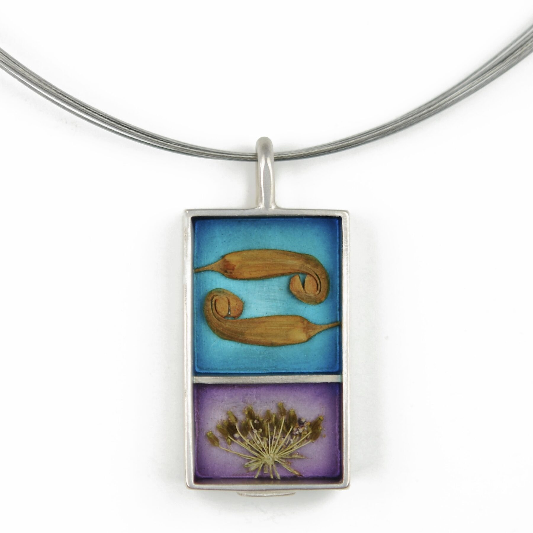 This compartment pendant is made from grevillea flowers and a wild fennel flower, suspended in hand dyed resins within a sterling silver bezel.