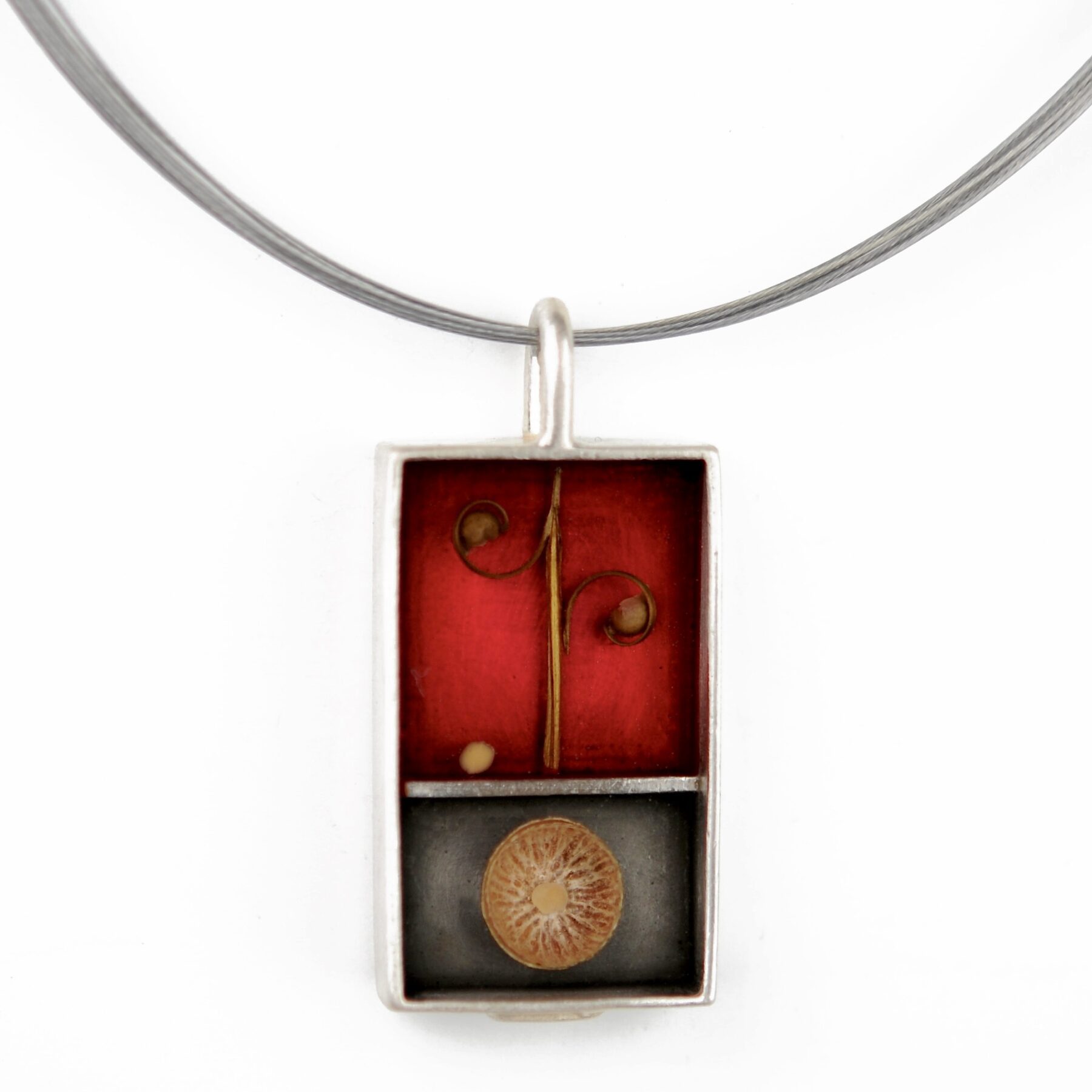Compartment Pendant: geranium and eucalptus on red and smoky black