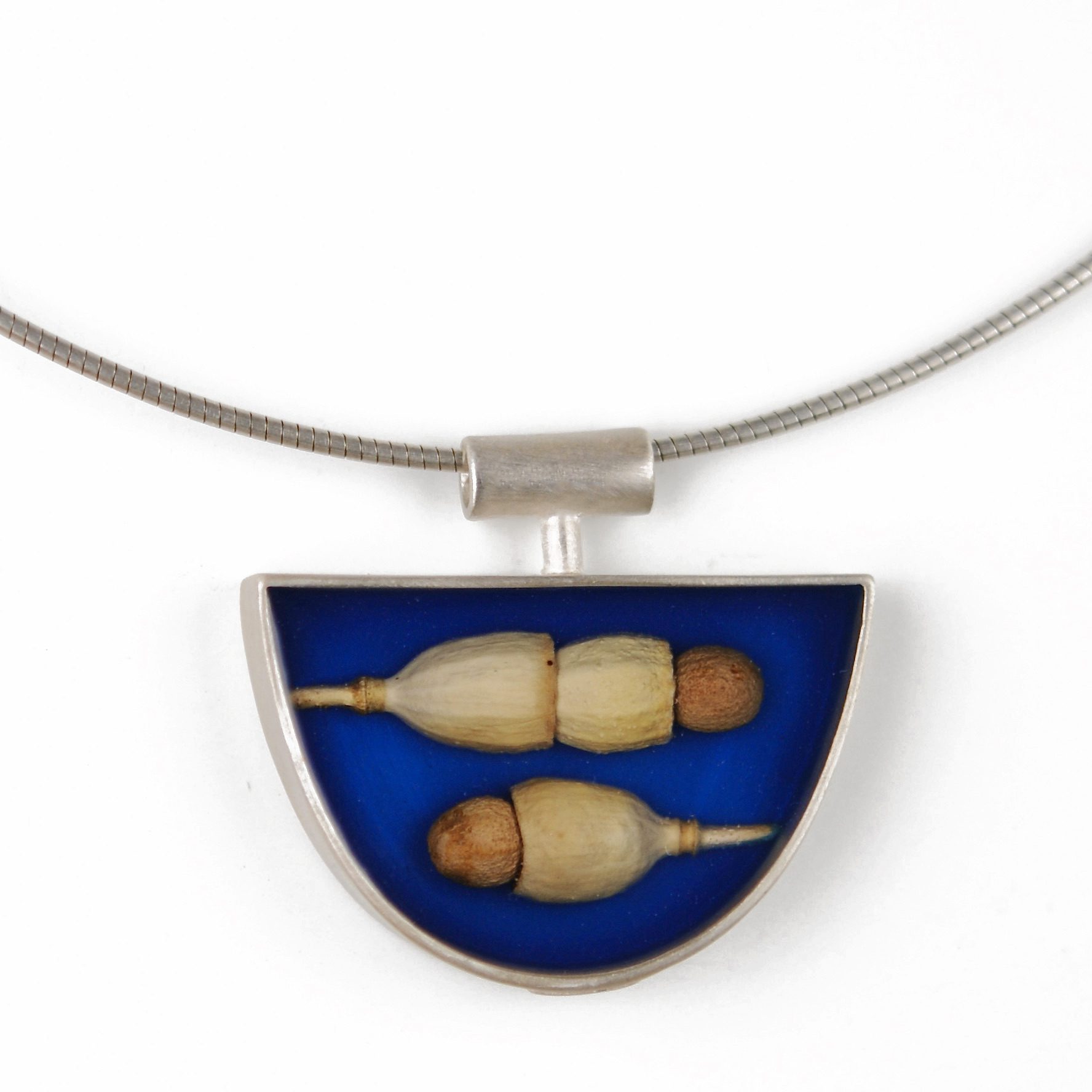 poppy pods, eucalyptus buds, resin, pigment, sterling silver (100% recycled content)