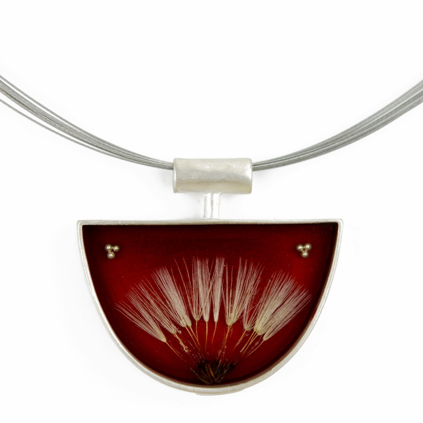 This half moon pendant is made from the pressed pappi of a local wildflower along with tiny glass balls, suspended in hand dyed resins in sterling silver.