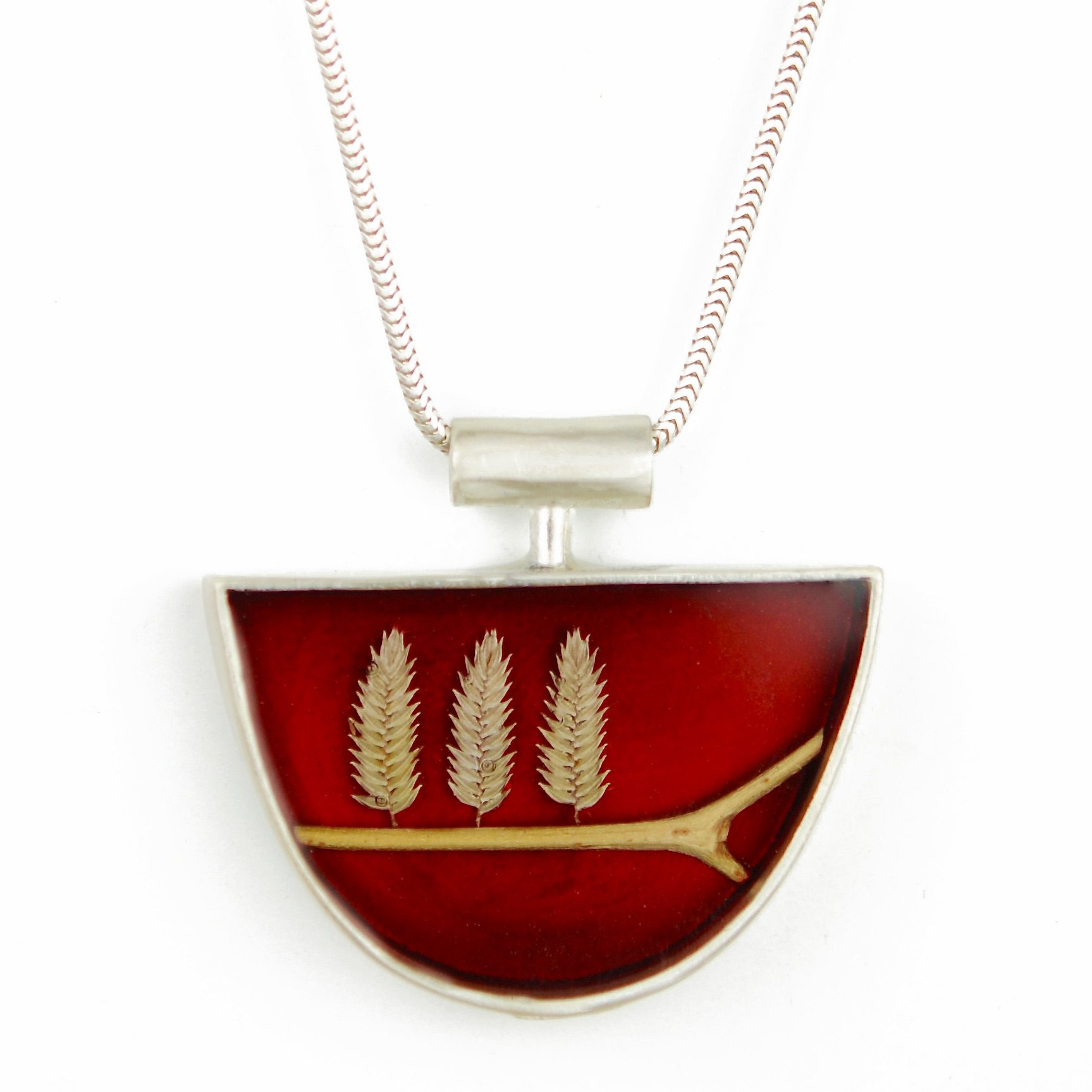 This half-moon pendant is made from a bougainvillea stem and three flatsedge bracts, composed and suspended in hand dyed resins within a sterling silver bezel.