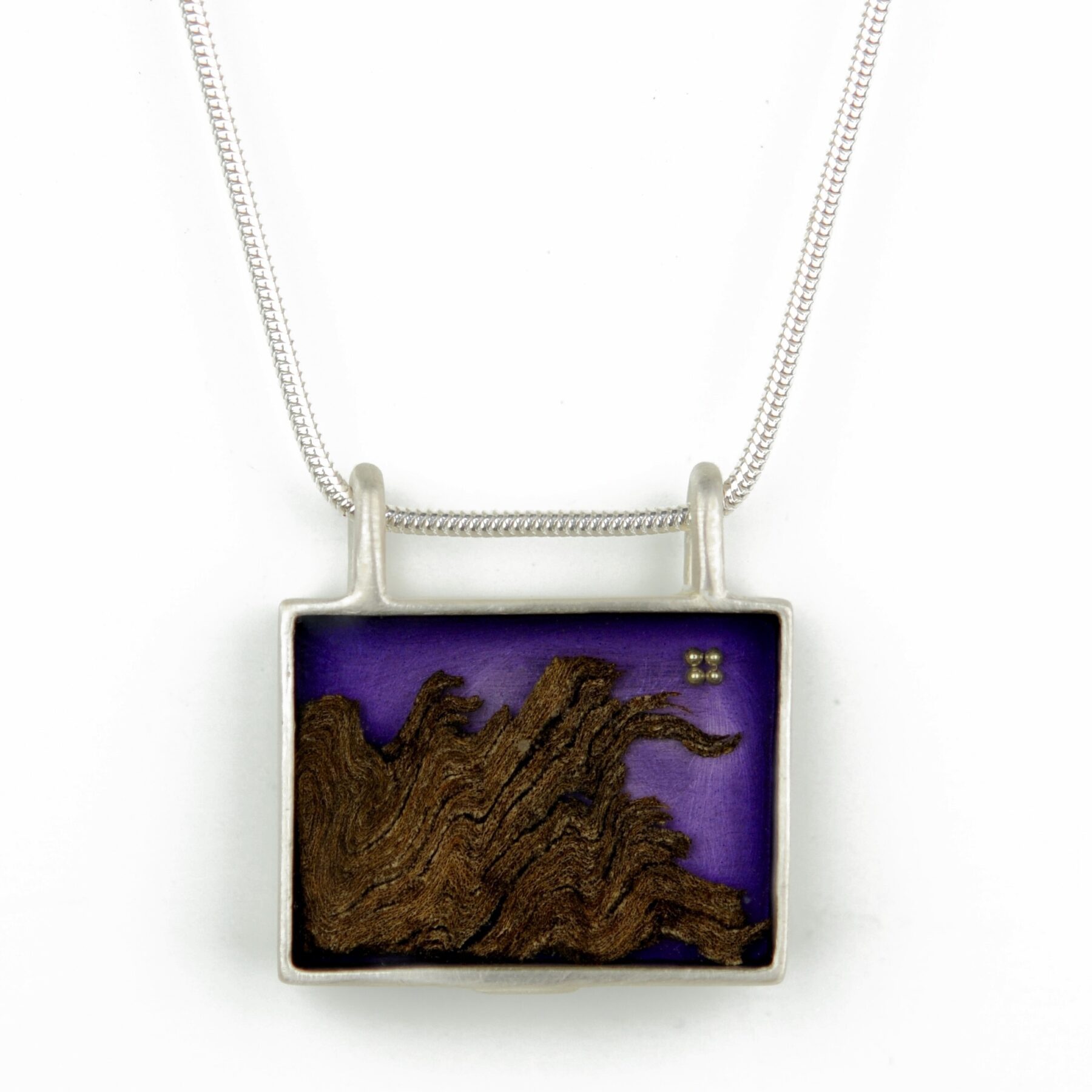 This horizontal pendant is made from a section of local eucalyptus bark as well as tiny painted glass balls. The elements are suspended in hand dyed resins within a sterling silver bezel.
