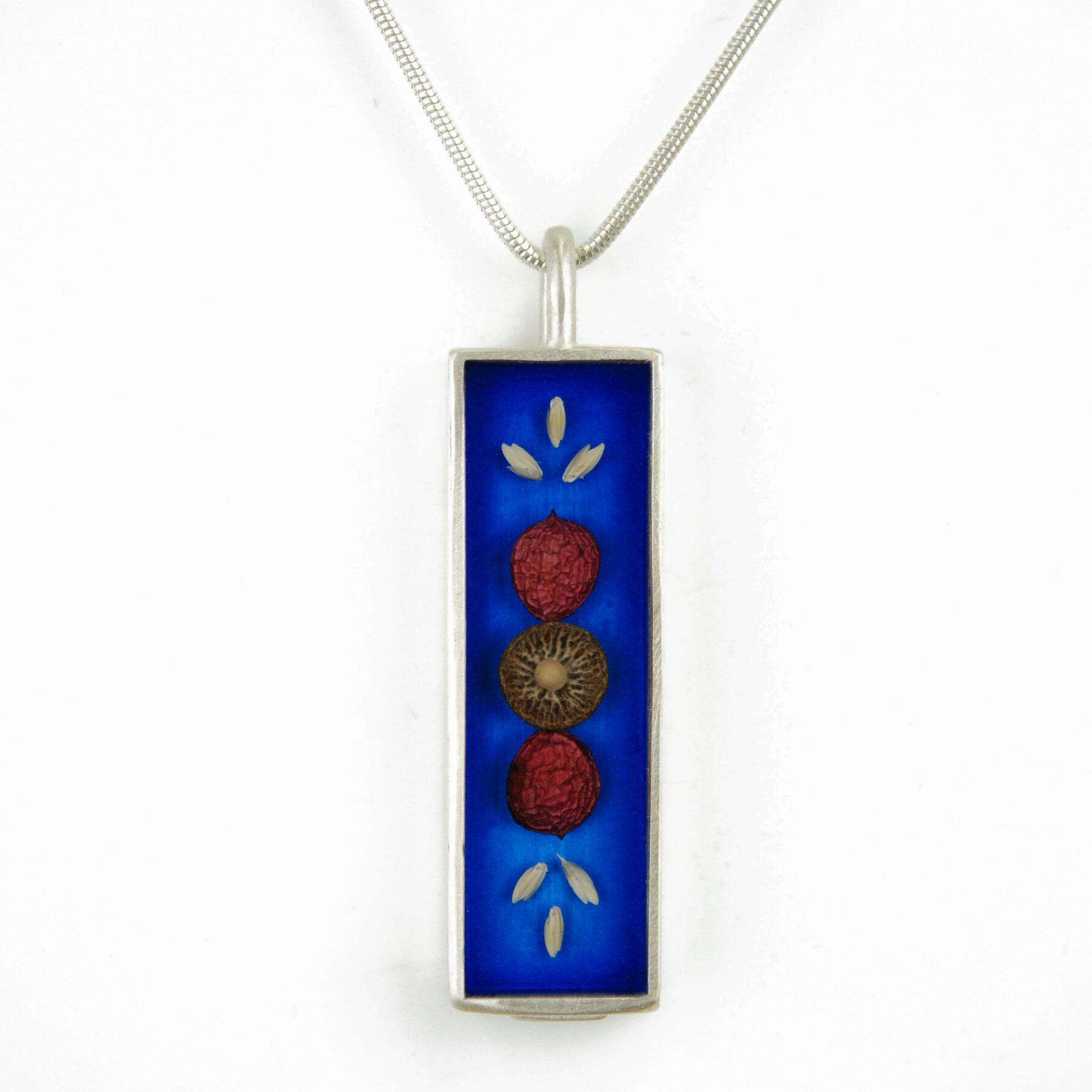 This long rectangular pendant is made from a variety of found local materials which are composed and suspended in hand dyed resin within a sterling silver bezel.