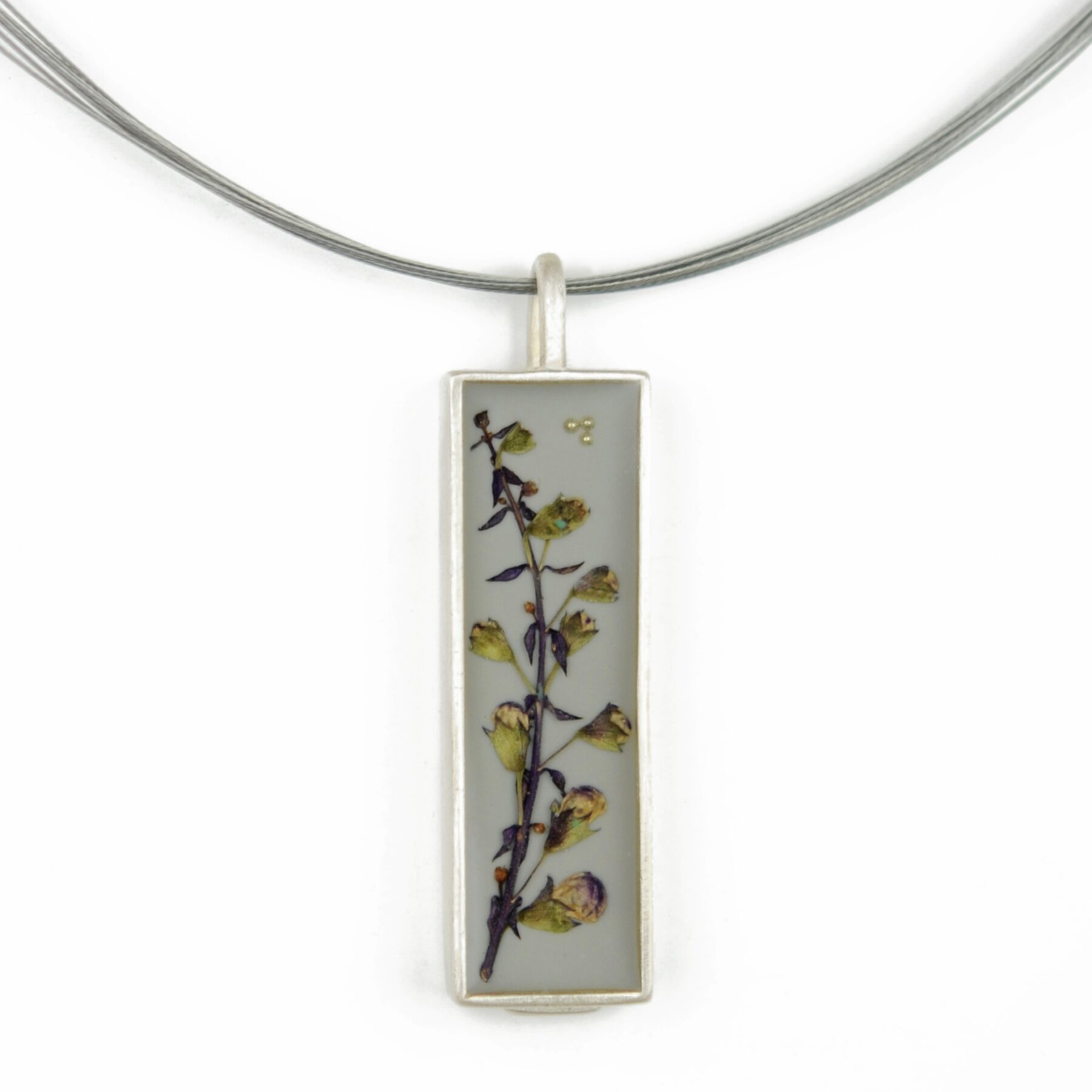 This piece contains a pressed local sage flower, as well as small glass balls, suspended in hand dyed resin within a sterling silver bezel.