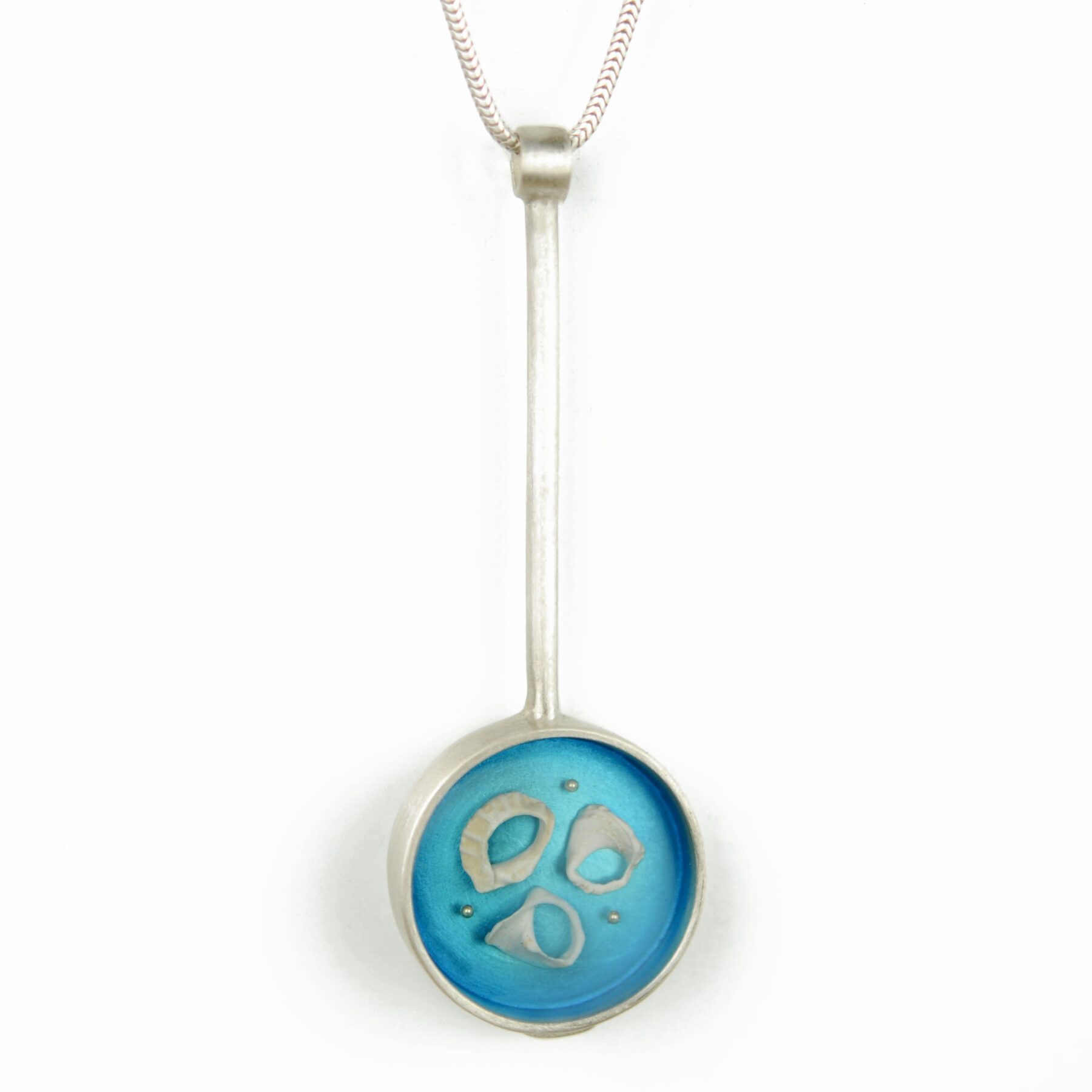 This long-stemmed round pendant is made from small fragments of weathered shells, found and saved from many years ago. They are suspended in fine layers of hand dyed resins within a sterling silver bezel.
