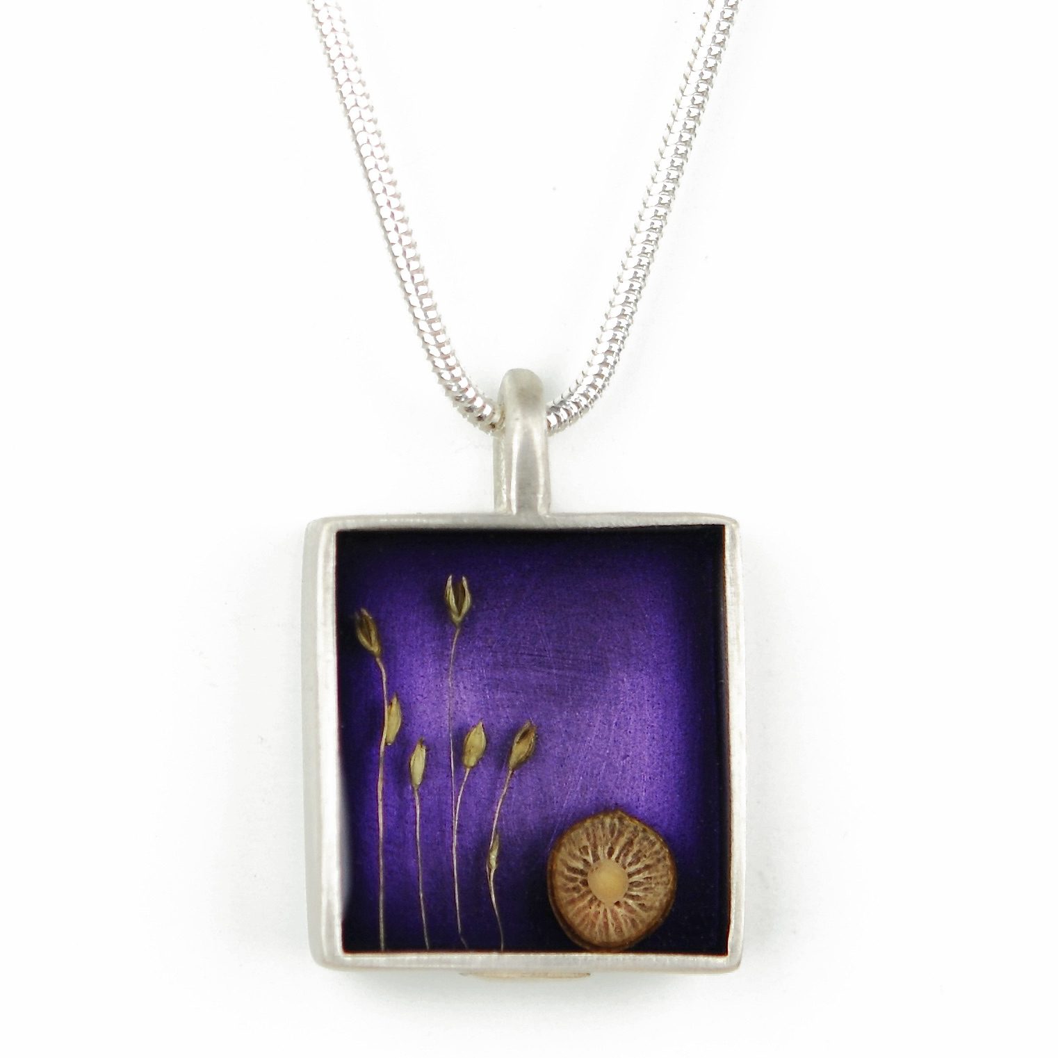 This medium square pendant is made from wild grasses and the cap from a eucalyptus capsule, as well as a mustard seed. The elements are composed and suspended in hand dyed resin within a sterling silver bezel.