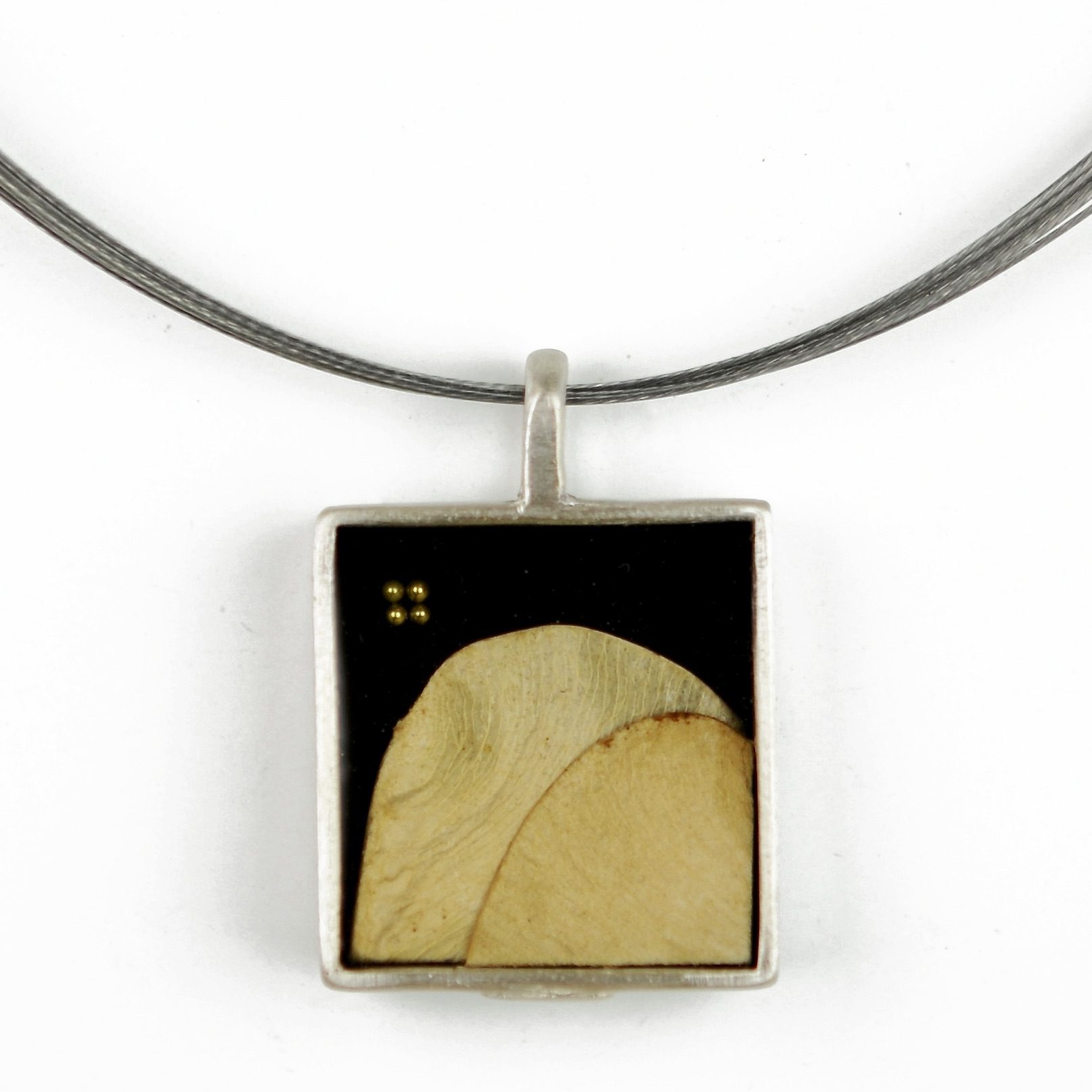 This medium square pendant is made from two layered sections of samaras from a tipu tree, as well as tiny glass balls. The elements are suspended in hand dyed resins within a sterling silver bezel.