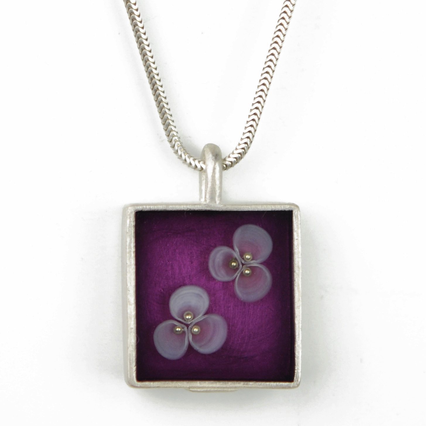 This medium square pendant is made from 6 tiny shells and glass balls, which are composed and suspended in hand dyed resins within a sterling silver bezel.