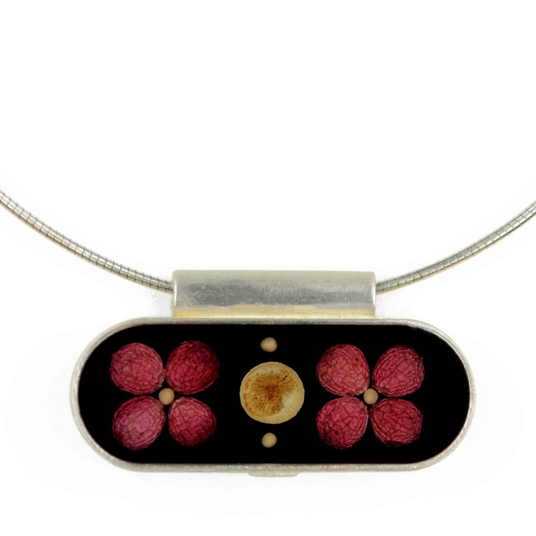 found berries, eucalyptus cap, mustard seeds, resin, pigment, sterling silver (100% recycled content)