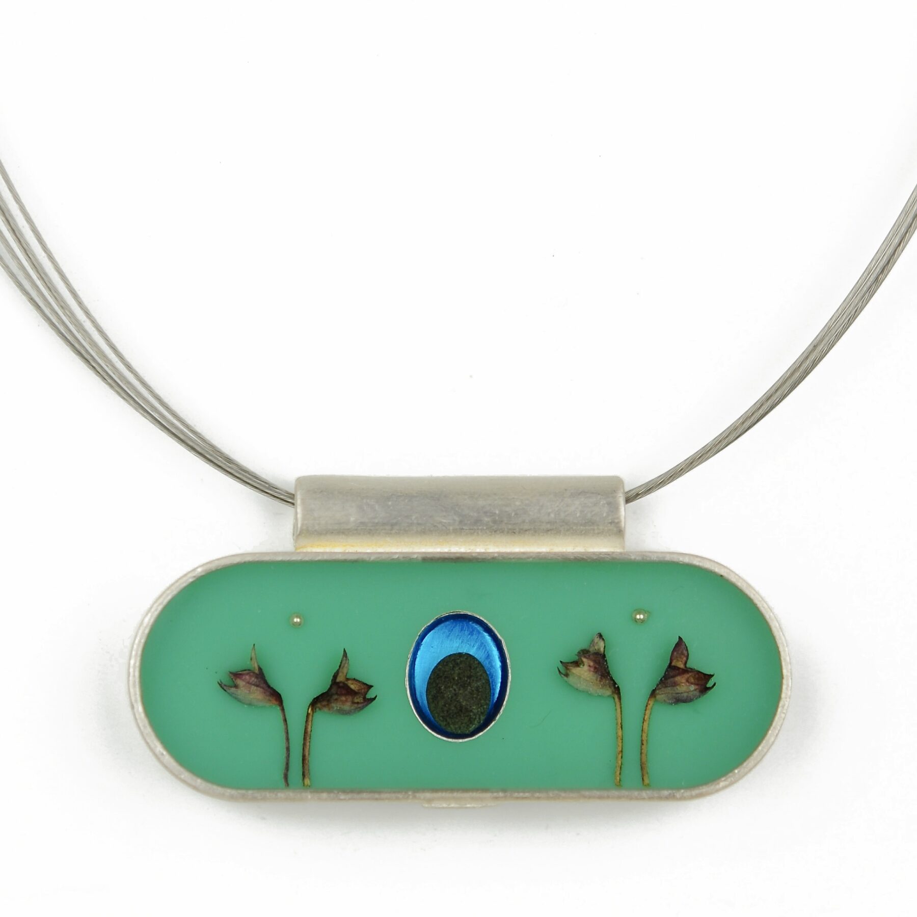 salvia stems, beach pebble, glass balls, resin, pigment, sterling silver (100% recycled content)