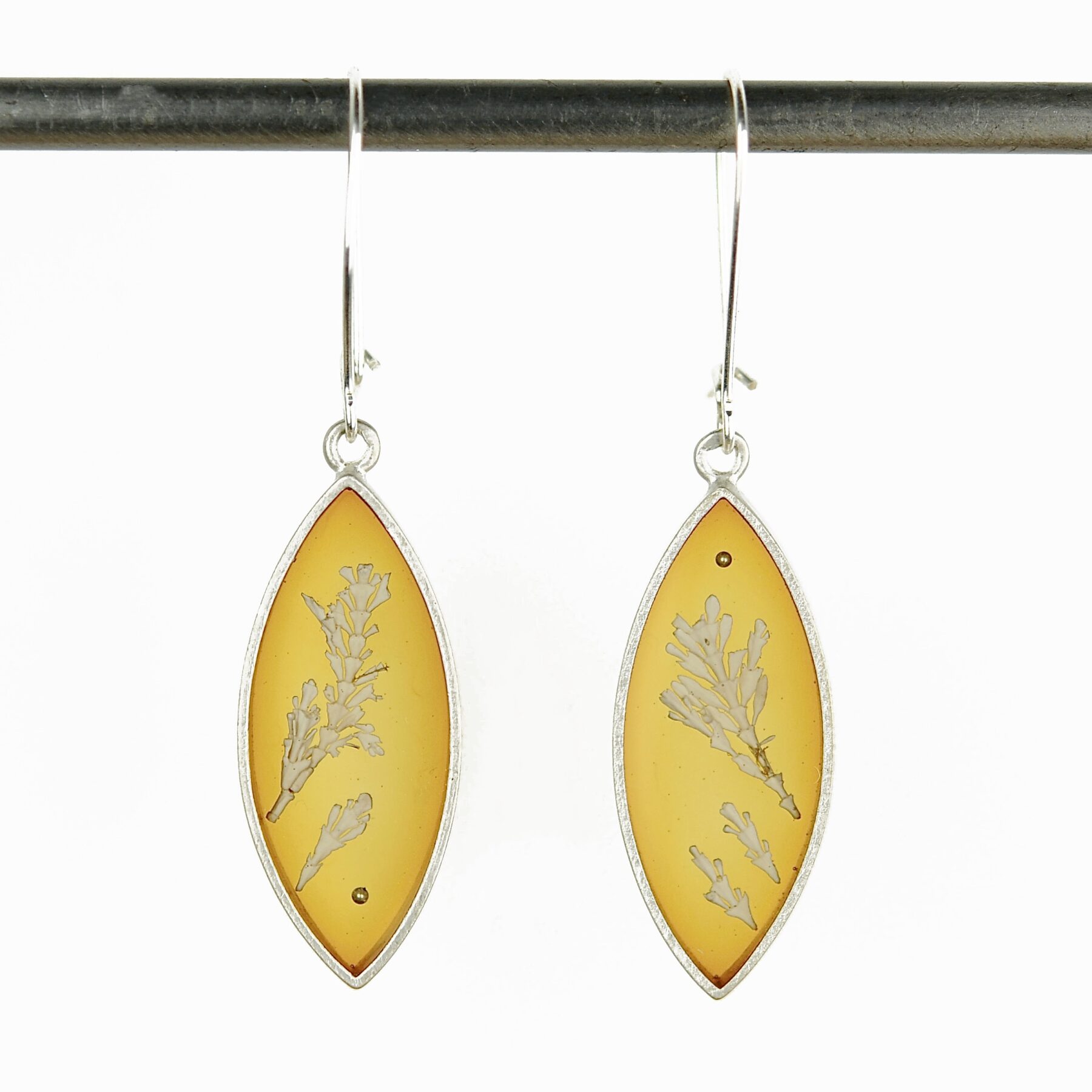 These petal-shaped earrings are made from sections of segmented seaweed, found on the California coast. The elements are suspended in hand dyed resins within sterling silver bezels.