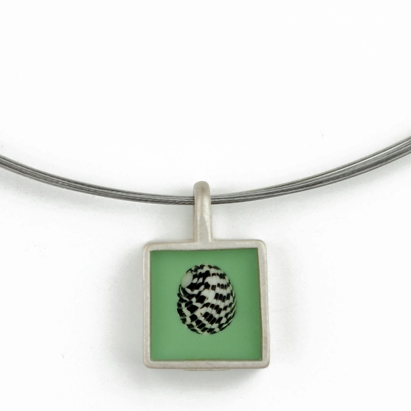 This small square pendant is made from a shell found in St Thomas, suspended in hand colored resins within a sterling silver bezel.