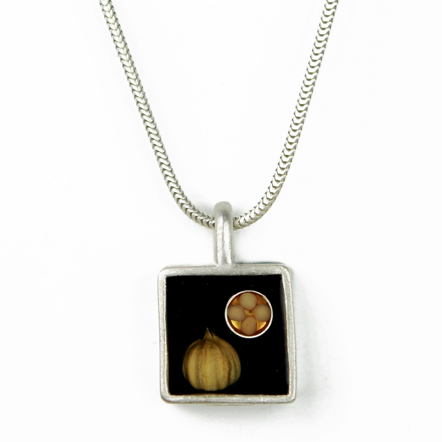 This small square pendant is made from a flax pod and mustard seeds which are suspended in hand dyed resins within a sterling silver bezel.